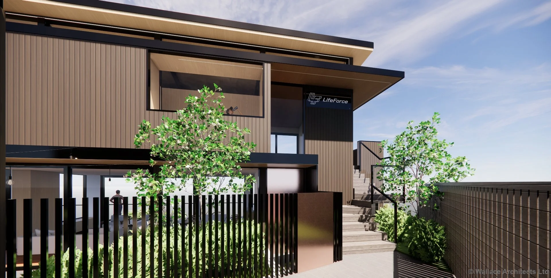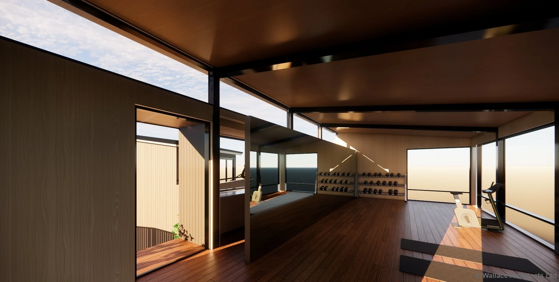 Currently at sketch design stage, the Fitness Coach studio is perched at the highest point of the site to capture commanding south-east harbour views through floor-to-ceiling glazing. This placement not only maximizes the inspirational outlook for clients but also establishes clear separation between business and residential functions. The studio's warm plywood-lined interior and exposed steel portals create an energizing yet secure environment, with abundant natural light flooding the space throughout the day. Supporting facilities including office, kitchenette and bathroom ensure the studio operates independently from the family home.